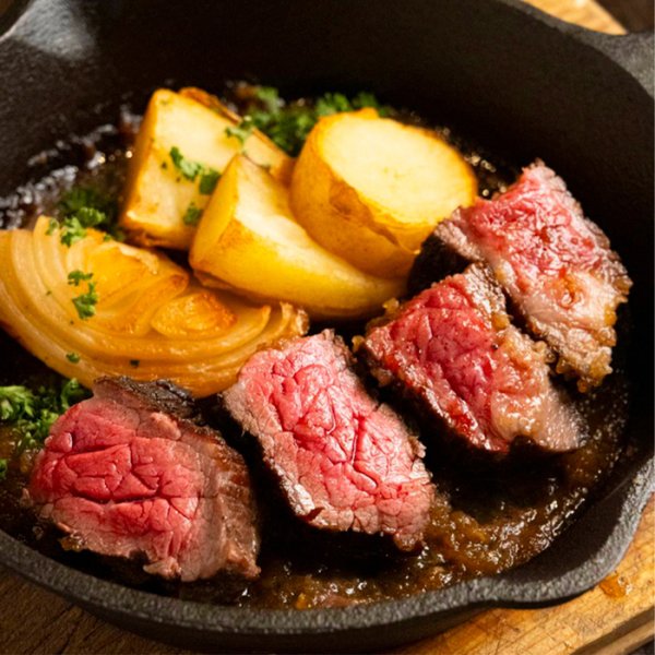 厚實卻柔嫩的牛肉,沾上以洋蔥與醬油為基底的醬汁入口,旨味在口中爆發!