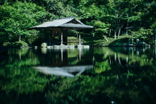 若沿著以池塘為中心配置的遼闊庭園漫步,步步皆有變換的美景映入眼簾。映於水面的綠意、歷史建築,以及在池中悠游的色彩斑斕錦鯉,皆能撫慰來訪者的心靈,使之寧靜安穩。